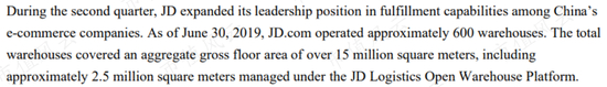 但是,增长的内含又有变化。在2019年二季度,京东披露的季报中首次提到云仓的面积达到250万平方米,总仓储面积1500万平方米。