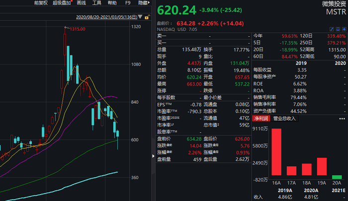 纳斯达克上市公司MicroStrategy(微策投资)在去年8月购入4.25亿美元的比特币,并于今年2月24日当周再度以10.26亿美元购买了19452枚比特币。截至3月5日,该公司持有比特币数量增至91064枚,总代价为22亿美元,平均价格约为24119美元/枚。目前,该公司持有比特币的价值接近46亿美元,浮盈超1倍。该公司股价近期也持续回调,自高点以来下跌超52%。