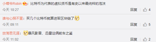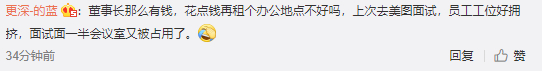 还有网友发问,“买几个比特币就算进军区块链了?”有网友称:“比特币为代表的虚拟货币是有史以来最纯粹的泡沫”,另有网友调侃到:“董事长那么有钱,花点钱再租个办公地点不好吗,上次去美图面试,员工工位好拥挤,面试一半会议室又被占用了。”