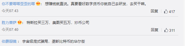 不过,对于美图公司购买比特币等加密货币的行为,很多网友并不买账,有网友直言,“想赚钱就直说。真要看好数字货币你就自己去研发,去买干嘛”、“特斯拉买三万,美图买五万,炒币公司”,认为美图公司购买比特币是纯粹的炒币行为。