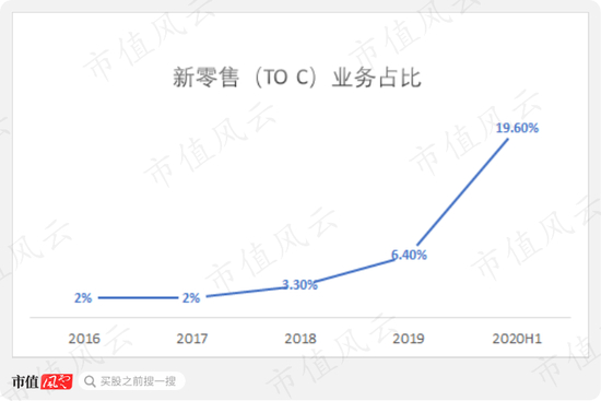 线上、线下合计营收由2016年4,650万增长到2019年2.5亿,2020年上半年新零售业务(即TO C业务)营收达3.73亿,较上年同期增长421.5%。其中线上、线下营收分别同比分别增长532%、289%。