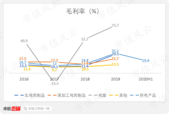 其中,鸡苗毛利率由-15.9%大幅增长到73.7%;生鸡肉制品毛利率由10.1%增长到29.5%;深加工鸡肉制品由17.3%增长至22.7%。