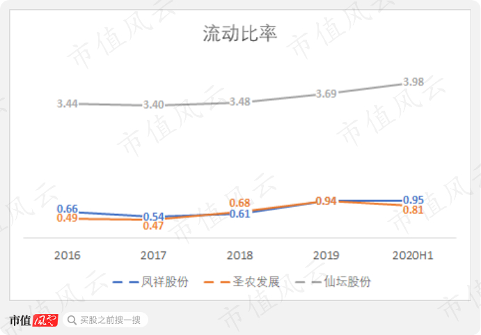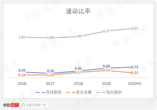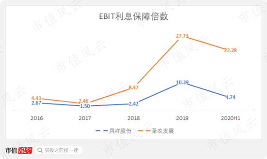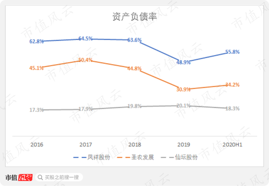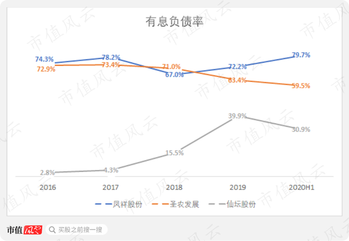 凤祥股份整体有息负债率(包括短期借款、长期借款、流动及非流动融资租赁款)较2017年78.2%经过短暂下滑后又进一步增长到2020年上半年的79.7%;而圣农发展、仙坛股份2020年上半年有息负债率分别为59.5%、30.9%。