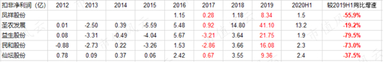 凤祥股份2020年中报显示鸡肉、鸡苗价格价格出现下跌,公司整体毛利率下降至19.4%,归母净利润为1.46亿,同比减少55.9%,行业其他公司归母净利润也均大幅下滑。