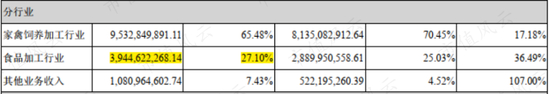 2019年,圣农发展的食品加工板块营收达39.4亿,占比27.1%。