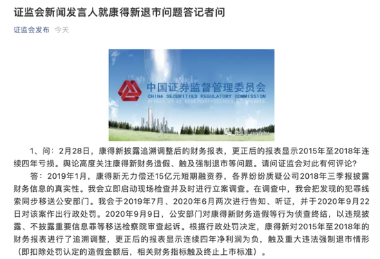 2020年9月22日,证监会对康得新财务造假等违法行为作出正式行政处罚。根据行政处罚决定,康得新对2015年至2018年的财务报表进行追溯调整。2021年2月28日,康得新披露追溯调整后的财务报表,公司2015年至2018年更正后的净利润分别为-14.81亿元、-17.55亿元、-24.60亿元、-23.57亿元,连续四年净利润为负,触及重大违法强制退市情形。