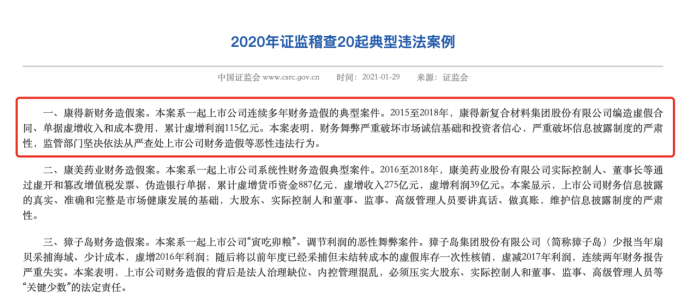 今年1月,证监会披露2020年证监稽查20起典型违法案例,其中康得新财务造假案位列第一。