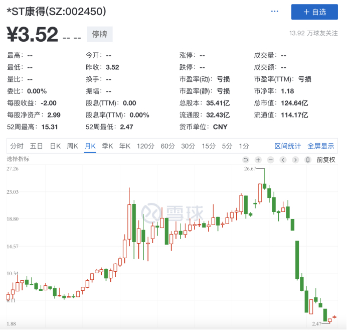 截至停牌前夕,*ST康得报3.52元/股,总市值蒸发超800亿元至126亿元。截至2020年三季度末,*ST康得仍有13.31万户。