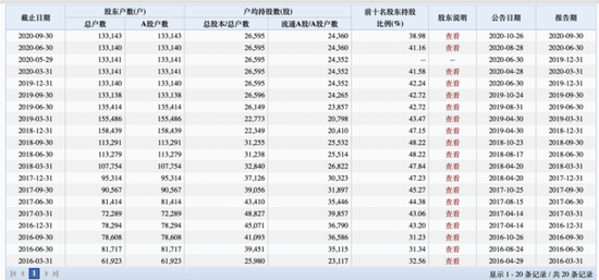 上市多年,康得新的股东户数在近年来持续走高,从2014年的1万股东到最高时期的15万股东。截至2020年三季度末,康得新仍有13.31万户股民。