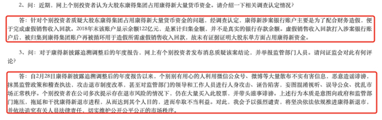 证监会表示,针对个别投资者质疑大股东康得集团占用康得新大量货币资金的问题,经调查认定,康得新涉案银行账户主要是为了配合财务造假,便于完成虚假销售收入回款。2018年末该账户显示余额122亿元,是累计归集金额,并不是真实的银行存款余额。虚假销售收入回款打入涉案银行账户后,被归集到康得集团账户再被循环用于造假所需虚假销售收入回款,故未有证据证明大股东单方面占用康得新资金。