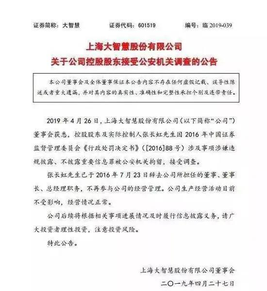2019年4月26日,大智慧发布公告称,控股股东及实际控制人张长虹因2016年中国证券监督管理委员会《行政处罚决定书》([2016]88号)涉及事项涉嫌违规披露、不披露重要信息罪被公安机关拘留,接受调查。公告称,张长虹已于2016年7月23日辞去公司所担任的董事、董事长、总经理职务,不再参与公司的经营管理。公司生产经营活动目前不受影响,经营情况正常。