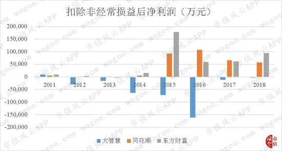 而到了2018年,大智慧营业收入5.94亿元,可同花顺和东方财富分别是13.87亿元和31.23亿元,分别是大智慧营业收入的2.34倍和5.26倍。7年间,同花顺与东方财富营业收入分别翻了近6倍和11倍,而大智慧基本没怎么动。而在业绩方面,大智慧更为惨淡,连续7年扣非亏损。