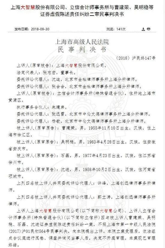 这是自2016年7月底启动诉讼索赔以来股民取得的首份胜诉判决,尽管只有一人获赔,但仍旧意义重大。不过很快,大智慧公司和立信会计师事务所都提起了上诉。2018年9月底,上海市高级人民法院驳回了大智慧以及立信会计师事务所针对大多数投资者索赔提起的上诉,大智慧虚假陈述索赔案中投资者获得终审胜诉判决。