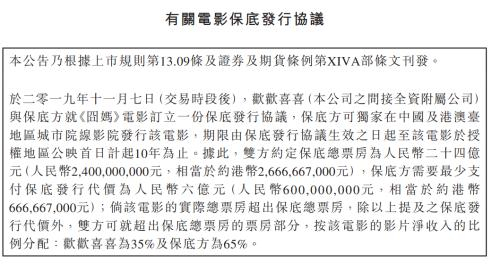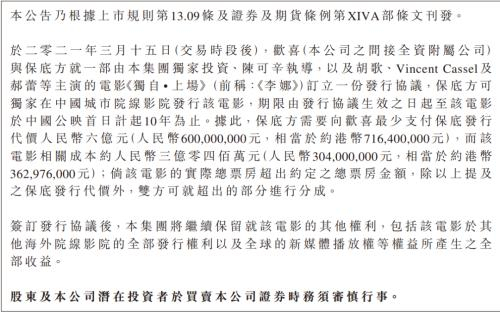 其中,保底方华文映像可独家在中国城市院线影院发行该电影,期限由发行协议生效之日起至该电影于中国公映首日计起10年止;华文映像则向欢喜传媒最少支付保底发行代价人民币6亿元,若该片实际票房超出约定之总票房金额,除以上保底发行外,双方可就超出部分进行分成。