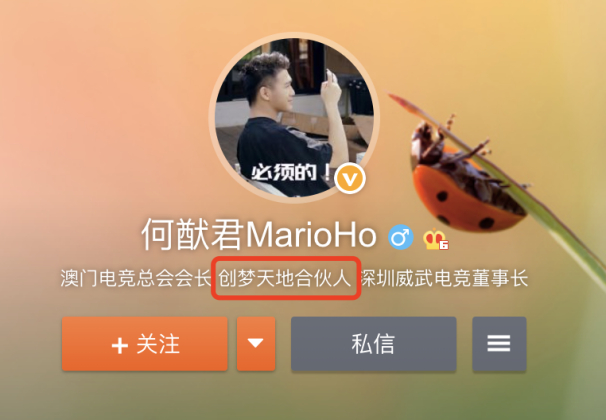 何猷君个人微博@何猷君MarioHo显示有三个身份:澳门电竞总会会长、创梦天地合伙人、深圳威武电竞董事长。2018年,创梦天地赴港上市敲钟时,他曾发文称“小时候无数次梦想这一刻”,年仅23岁成为了港交所最年轻的敲钟者。