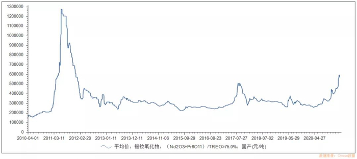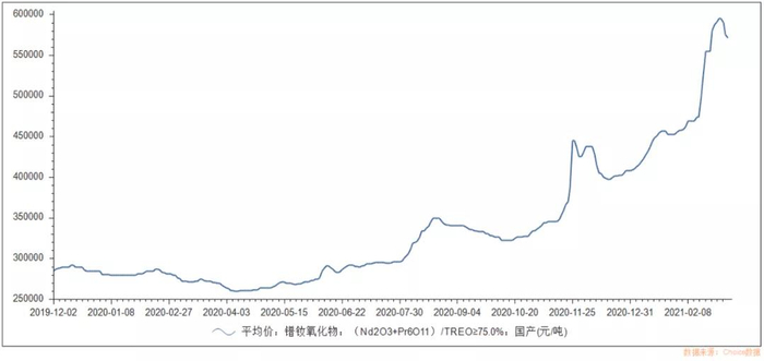 有投资者认为,稀土板块走高不过是一时事件驱动刺激下产生的炒作结果,但事实上并非如此。稀土价格在2020年年末就已经呈现回暖趋势,主要原因在于供需关系改善、稀土价格大幅度上升。以在北方稀土白云鄂博稀土精矿占比较高的镨钕氧化物为例,从2020年4月开始,稀土价格逐渐回暖,在2020年10月后价格增长加速,当前处于阶段性高位,2021年3月达到了约59.85万元/吨。