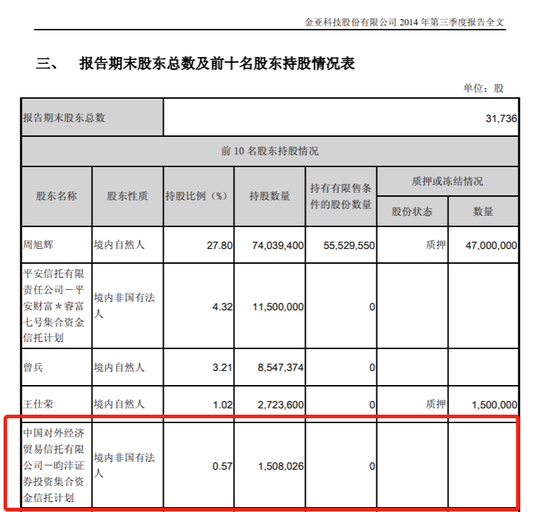 公司在披露的2014年三季报显示,王亚伟旗下的中国对外经济贸易信托有限公司-昀沣证券投资集合资金信托计划现身公司前十大股东席位,持股150.80万股,持股比例为0.57%。