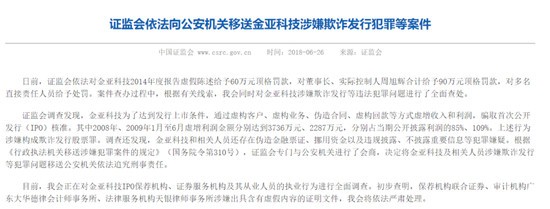 2018年6月26日,证监会官网披露,日前,证监会依法对金亚科技2014年度报告虚假陈述给予60万元顶格罚款,对董事长、实际控制人周旭辉合计给予90万元顶格罚款,对多名直接责任人员给予处罚。案件查办过程中,根据有关线索,证监会同时对金亚科技涉嫌欺诈发行等违法犯罪问题进行了全面查处。