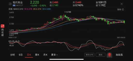 今日开盘后,现代牧业一度大涨超5%,不过随后股价有所回落,截至今日收盘,其股价报2.22港元,下跌3.9%。