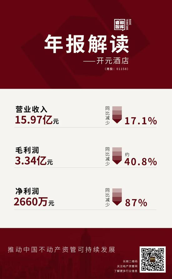 酒店业是疫情期间受冲击最大的行业之一,疫情导致大部分旅游、会议和商务旅行无法实现。开元酒店集团2020年年报显示,报告期内,实现营业收入15.97亿元,同比减少17.1%。期内毛利3.34亿元,同比减少40.8%。期内净利润2660万元,同比减少87%。归属股东净利润1970万元,同比减少90.3%。