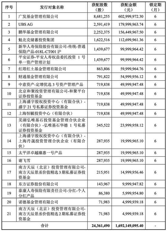 这份定增预案最终在当年9月完成,最终的定增价为69.46元,募资金额16.92亿元,发行对象为20名机构和一名个人。