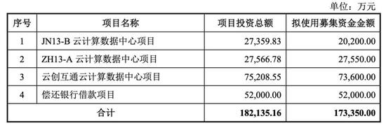 2020年3月,数据港发布非公开发行预案,计划筹资17亿元用于未来三个云计算数据中心的建设和偿还银行借款(见下图)。
