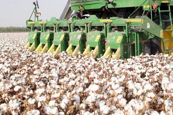 资料图:采棉机正在抢收新棉。图片来源:视觉中国