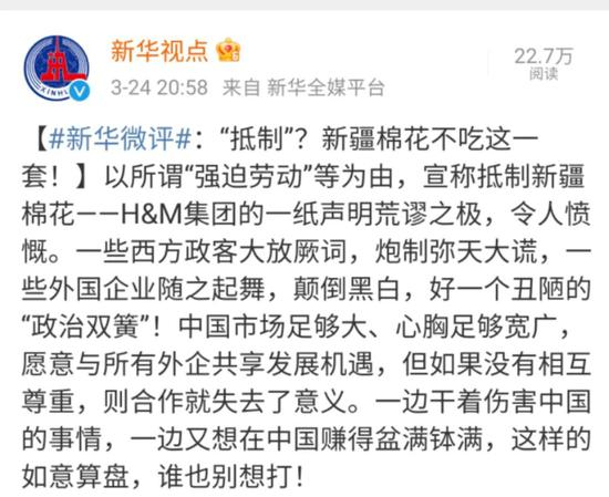 24日H&M“声明抵制新疆产品”被曝光后,引发网友众怒,众多电商平台、手机应用商店以及知名艺人一时间纷纷抵制,各大央媒集体发声。面对中国网友的怒火,H&M集团瑞典总部24日表示,“无法在电话中做出回应,将在查看邮件后回复”。而“H&M中国”微博账号24日晚发表声明称,H&M集团一贯秉持公开透明的原则管理我们的全球供应链,并不代表任何政治立场。
