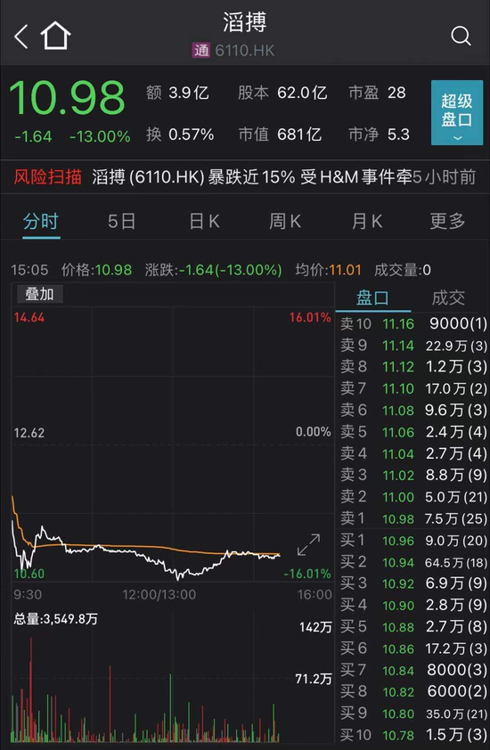 受H&M事件牵连,港股滔搏(06110.HK)盘中一度暴跌近15%,最低至10.74港元。截至发稿时,下跌13%,股价报10.98元。耐克是滔搏的主要合作经销方。