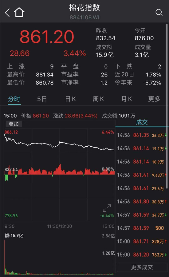 棉花指数早间逆势上涨,截至发稿,上涨了3.44%,报861.20。