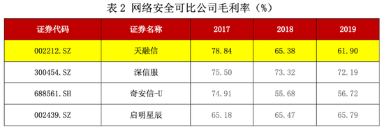 这一原因或许可以从毛利率的变化上寻找原因。根据数据,天融信2017年到2019年的网安毛利率分别为78.84%、65.38%、61.90%,可以看出三年内毛利率下降了接近17%,而其他三家公司的毛利率则较为稳定。天融信在业绩快报中也表示,2020年公司毛利率为65.65%,相较于2019年已有大幅回升。