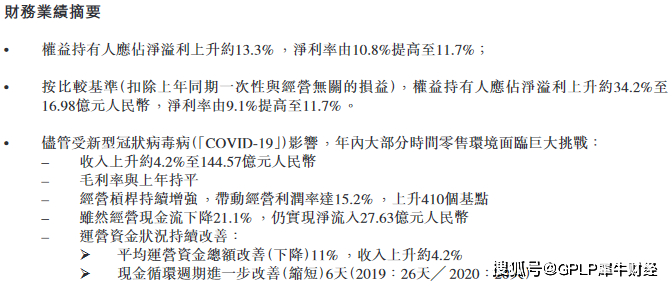 3月19日,李宁(02331.HK)披露了业绩公告,2020年全年收入为144.57亿元,同比上升4.2%;权益持有人应占净溢利为16.98亿元,同比上升13.3%;毛利率为49.1%,与2019年持平;经营现金净流入27.63亿元,同比下降21.1%。