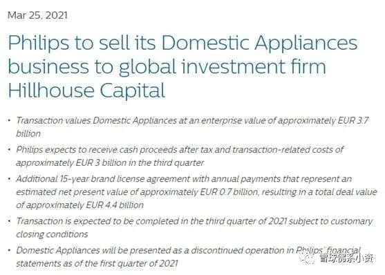 3月25日,全球健康科技公司飞利浦(NYSE:PHG;AEX:PHIA)宣布已签署协议,将其家用电器业务出售给知名投资公司高瓴,交易金额约为37亿。此外,飞利浦将与家用电器通过独家全球品牌授权协议,许可家用电器继续使用飞利浦品牌及其旗下特定家用电器产品之品牌在全球范围内进行生产制造、品牌营销和市场销售,授权期限15年,并可视条件延长。