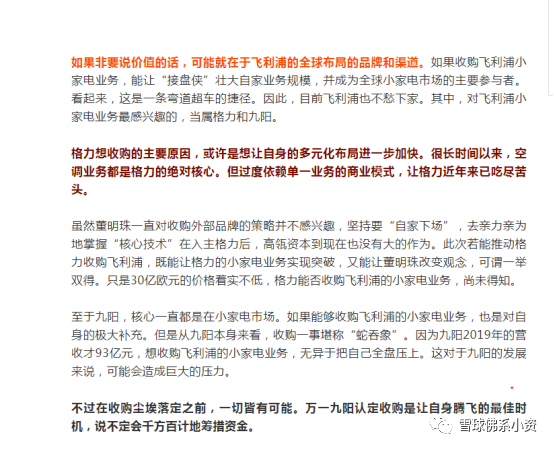 阿姨两会说的高瓴资本带来资源应该就是这个,飞利浦的渠道以及品牌等等。所以总之,格力的想象空间已经打开,但是我还是觉得到时候要扒开内部看,可能后面是格力电器站位高瓴资本出面去完成这项收购计划的。具体操作高瓴和董总已经商讨完成,不过高瓴资本很看好家电制造行业,格力、公牛、飞利浦还有其他公司,这些合计起来都是大手笔的收购了。但高瓴资本把收购来的飞利浦给公牛可能性很小小,这样看还是格力大一些。那我们就等待市场验证吧!