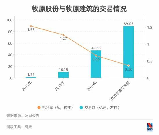 巨额的关联交易是牧原股份被质疑的关键点之一。2017年~2019年及2020年前三季度,牧原股份与牧原建筑的交易额分别为1.33亿元、10.18亿元、47.38亿元和89.05亿元。同期,牧原建筑毛利率分别为1.53%、1.27%、0.66%和0.36%。