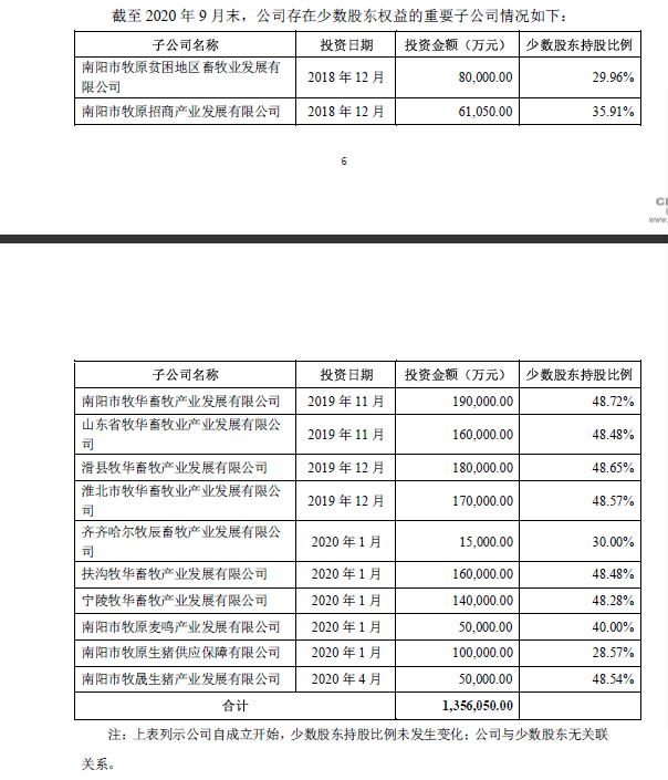 截至2020年9月末,牧原股份存在少数股东权益的重要子公司共有12家。2018年成立的共有2家,2019年成立的共有4家,去年成立6家。
