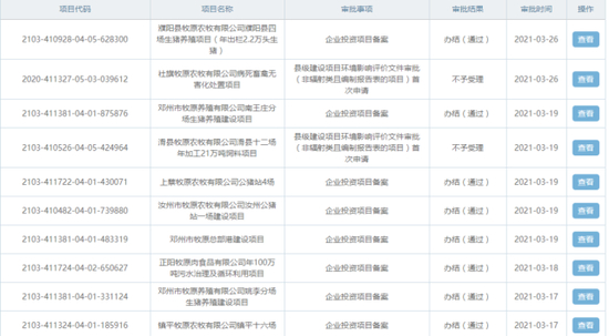 其中,今年3月19日,滑县牧原农牧有限公司滑县十二场年加工21万吨饲料项目不予受理;3月11日,杞县牧原农牧有限公司于镇后城分场生猪养殖项目不予受理;3月4日~5日,商水牧原农牧有限公司商水二十二场生猪养殖项目、河南牧原肉食品有限公司滑县年屠宰200万头生猪项目不予受理;去年6月18日,上蔡牧原农牧有限公司二场生猪养殖项目未通过审批。