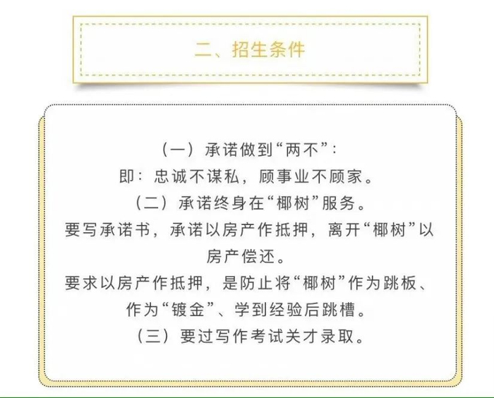 二要承诺终身在“椰树”服务。要写承诺书,承诺以房产作抵押,离开“椰树”以房产偿还,并要求以房产作抵押,是防止将“椰树”作为跳板、作为“镀金”、学到经验后跳槽。
