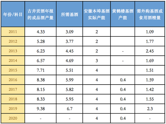 根据上文的推理,由古井贡每年的成品酒产量,倒推得出的基酒产量,远远高于其实际基酒产能。即便满负荷生产,基酒缺口也非常巨大,见表2。