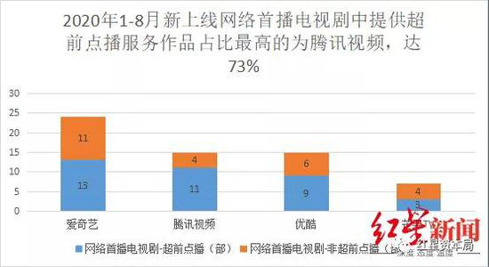 汇总2020年1月到8月几大平台数据与国家广播电视总局相关数据,爱奇艺在此期间共推出24部作品,其中超前点播剧集13部;腾讯视频共播出剧集15部,其中超前点播11部;优酷新增剧集15部,其中超前点播数量为9部。
