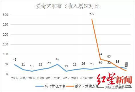 这场拉锯战之后,最终形成“爱优腾”三足鼎立的格局。对比爱奇艺与奈飞的收入增速,可以看出会员付费形成的差别:2015年,爱奇艺推出会员付费后,其收入增速一度达277%,之后付费收入增速不断下滑;对比奈飞,可以看出其收入增速趋于平稳增长(见下图)。