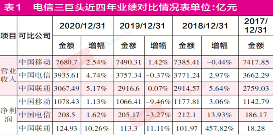 从表1来看,虽然在营收增长上,三大运营商2017年以来均实现增长,但收入规模增速却都不快。净利润方面,三者不再同步,之间存在明显分化。比如中国移动,2020年的净利润实现额还不如2017年,相当于发展4年后出现退步;中国电信2020年的净利润虽比2017年高,但实际上也比不上2018年,基本负增长;中国联通近几年是一直增长的,但因其前期实力太弱,经营业绩基数很低,即便是业绩出现了连续增长,实现金额仍在三家公司中“吊车尾”。