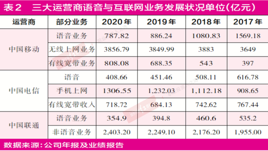 俗话说“一叶知秋”,从三家公司财报披露的数据不难看出,电信巨头们的业务构成在这几年是不断变化的,曾经收入蛋糕中占比很高的语音收入(电话费、装机等收入)如今已经越来越低了,2017年至2020年,中国移动语音业务收入同比下降了49.79%,中国电信语音收入同比下降33.74%,中国联通语音业务同比下降33.69%。