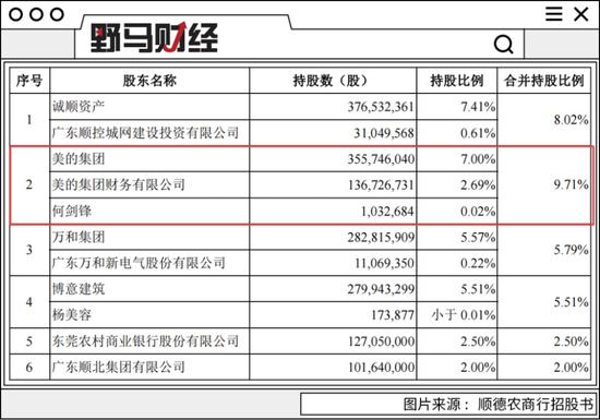 何剑峰还携手美的入股了有着顺德“金库”之称的顺德农商行。目前该银行正在准备IPO,《招股书》显示,第二和第五大股东为美的集团、美的财务公司,何剑锋个人持股0.02%,三者合计持股9.71%,力压包括诚顺资产和广东万和集团在内的股东。