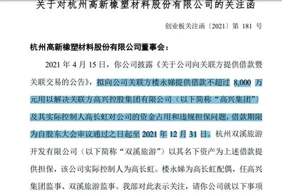 4月15日,杭州高新披露公告,拟向公司关联方楼永娣提供借款不超过8000万元,用以解决关联方高兴控股集团有限公司(以下简称“高兴集团”)及其实控人高长虹对公司的资金占用和违规担保问题。杭州双溪旅游开发有限公司(以下简称“双溪旅游”)以其名下资产为上述借款提供担保。