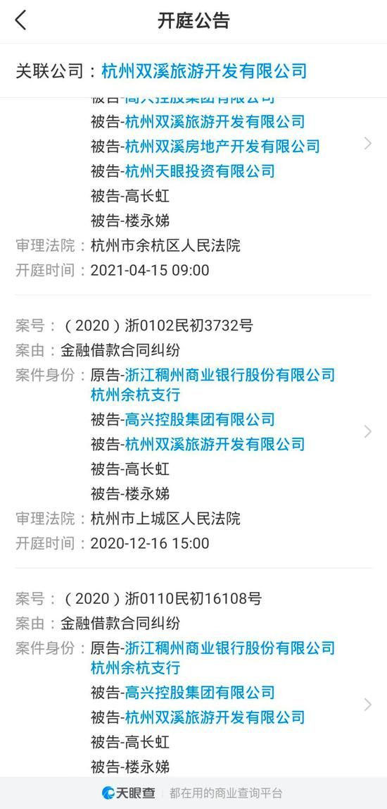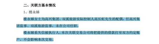 据查,高长虹的配偶楼永娣,系失信被执行人。公开资料显示,作为担保方的双溪旅游卷入多起诉讼,截至2020年末净资产仅2133万元。另外,多起诉讼中,高长虹、楼永娣、高兴集团、双溪旅游成为共同被告。