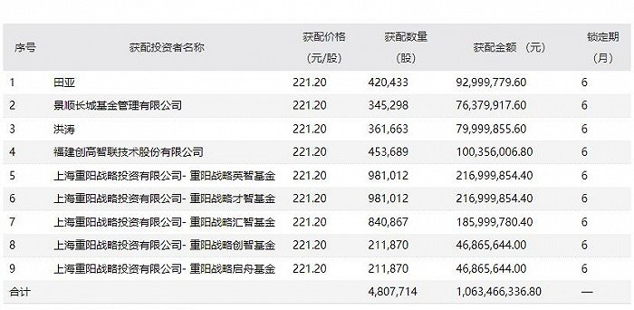 从最终结果看,获配的机构投资者有景顺长城基金管理有限公司、重阳投资和创高智联(831464.OC)。其中,重阳投资下注最重,合计投资金额接近7.14亿元。重阳投资由裘国根创立,是国内老牌明星私募之一。