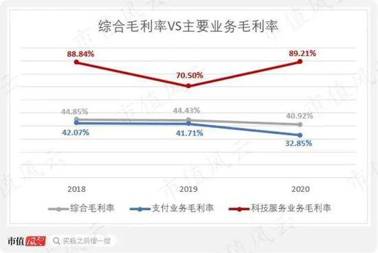 正因科技服务业务的客户群体大部分从支付业务的商户处引流而来,其获客成本已经被支付业务摊薄甚至为0,因而科技服务业务的毛利率经常能保持在70%以上。
