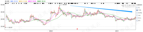 (2019.4~2021.4拉卡拉股价走势图,来源:东方财富网)