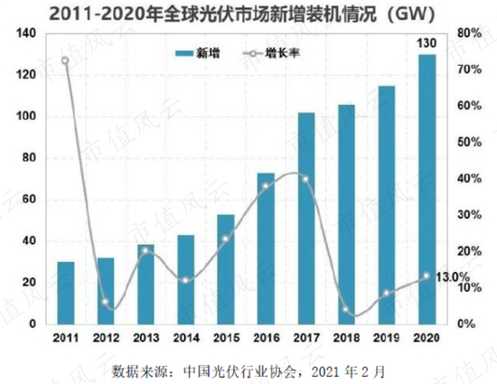 根据中国光伏行业协会发布的数据,2020年,全球光伏新增装机量为130GW,同比增长了13%;中国光伏组件产量为124.6GW,同比增长了26.4%,其中出口海外市场的为78.8GW,同比增长了18%。